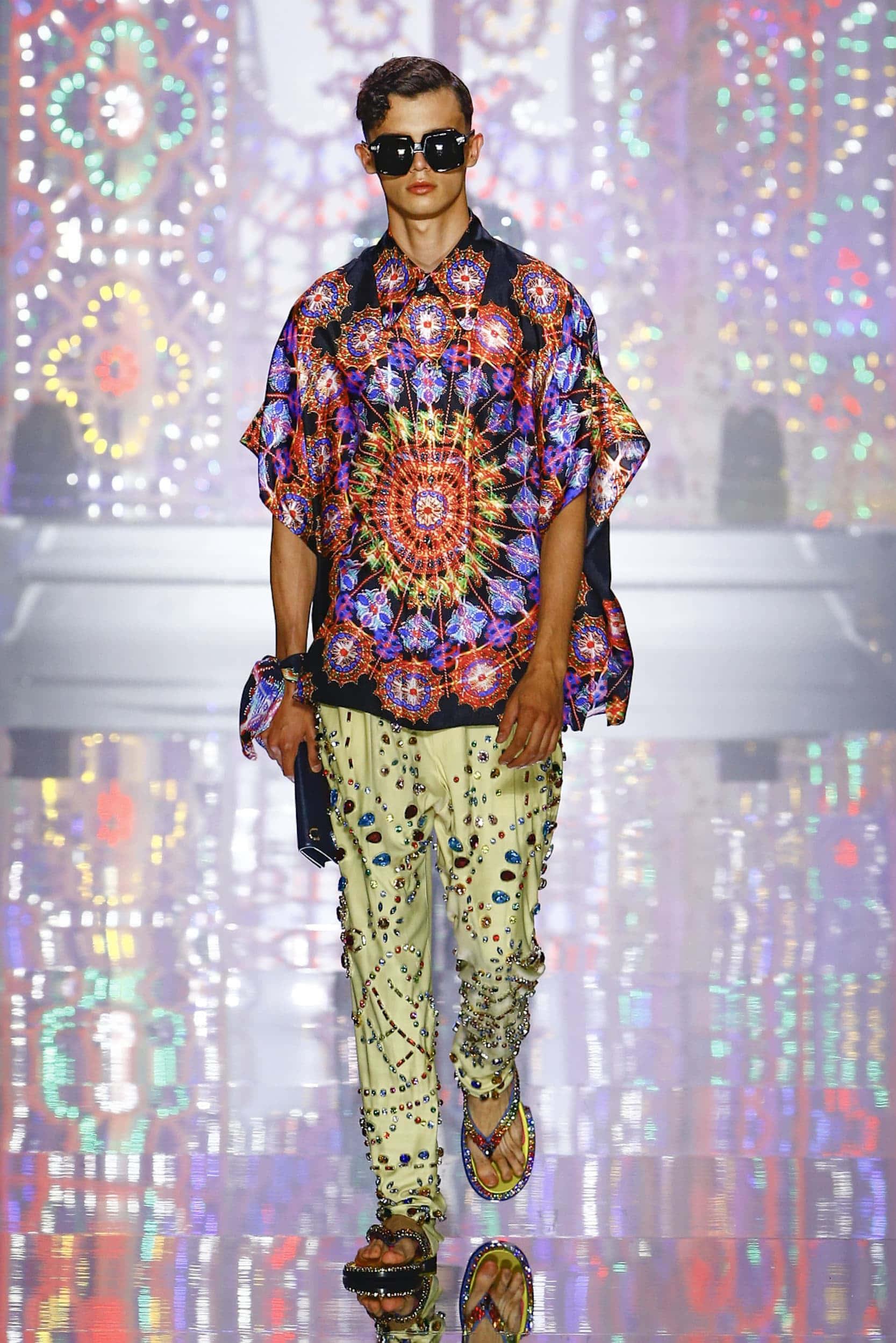 A man in a colorful outfit walks the runway, showcasing bold fashion in this vibrant wallpaper.