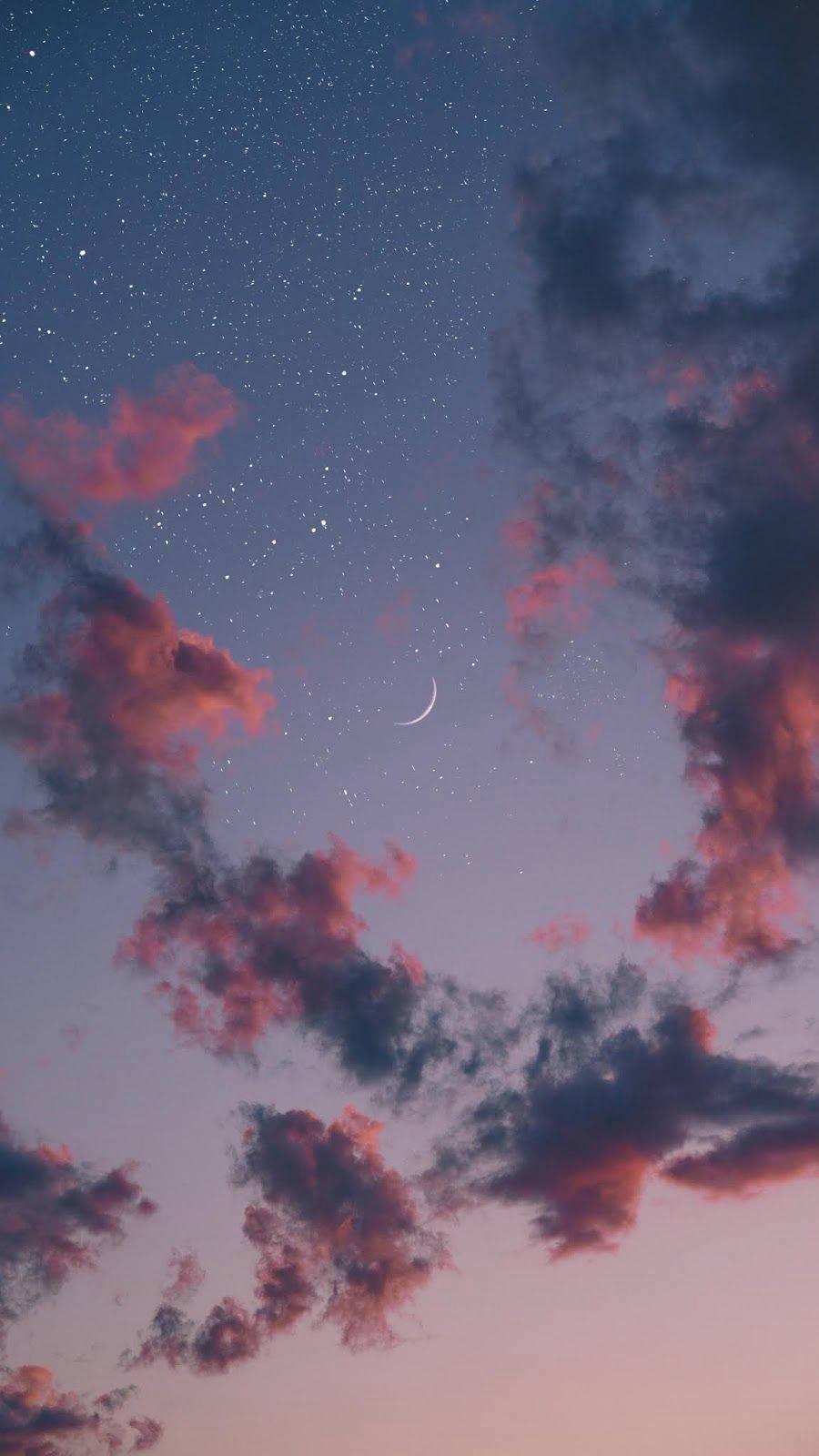 Transform your iPhone with this elegant wallpaper depicting a crescent moon and starry sky, surrounded by soft blue and pink clouds.
