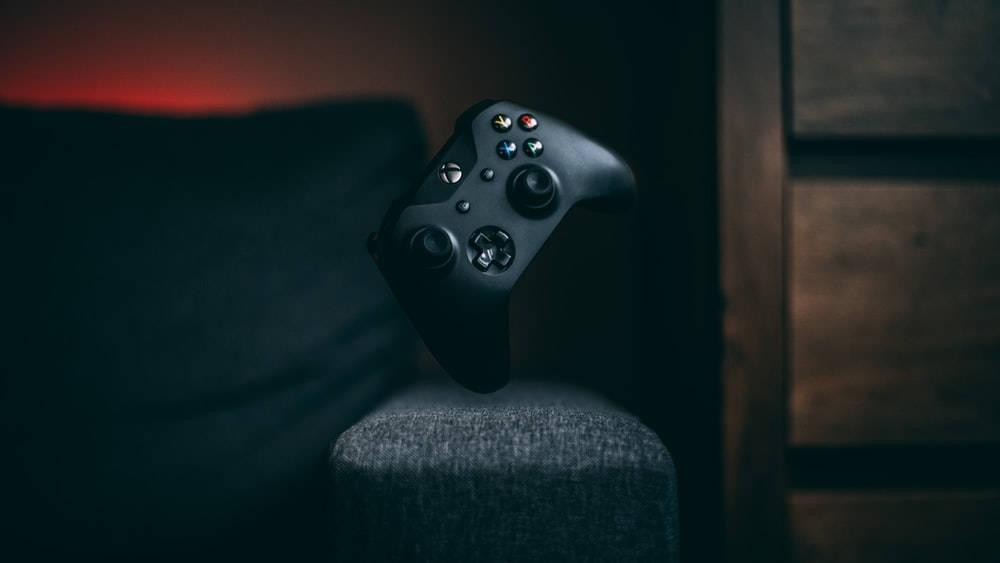 Capture the moment with this balanced Xbox controller, elegantly poised on a sofa arm in a dark, atmospheric setting.