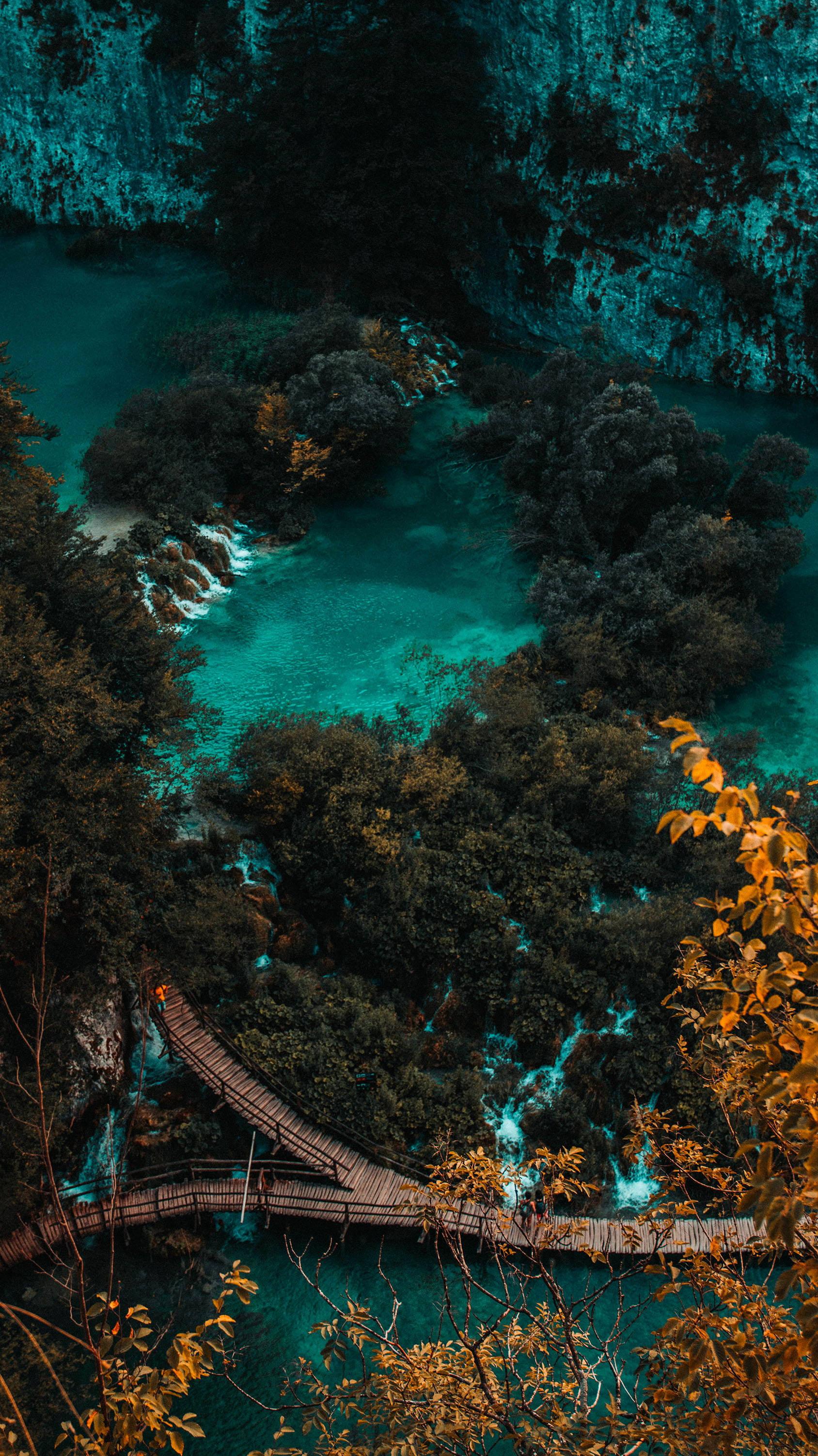 Explore serene bridges crossing a pristine blue river landscape, surrounded by lush trees and natural beauty.