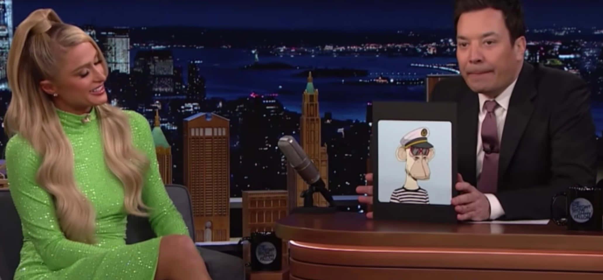 Enjoy an interactive moment between Jimmy Fallon and Paris Hilton, captured in this fun and lively celebrity picture.