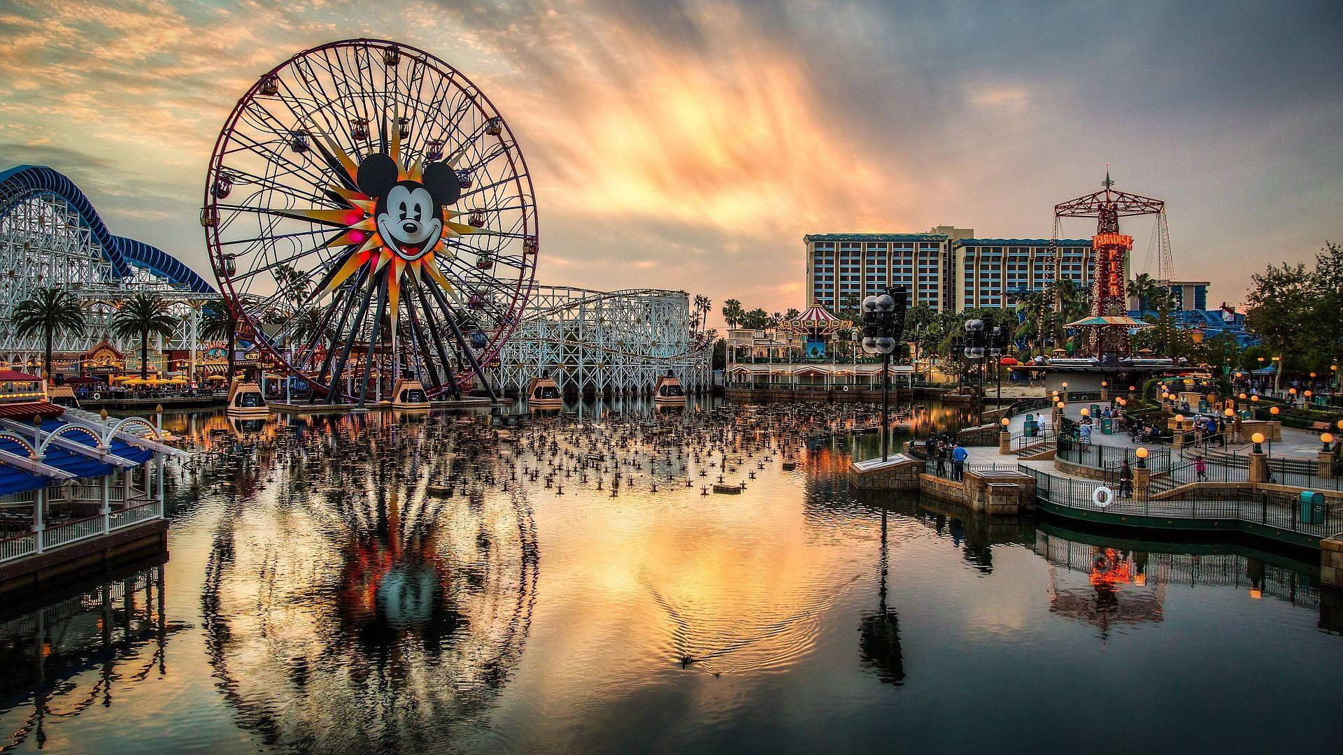 Experience the vibrant energy of a theme park, with rollercoasters and Ferris wheels set against a lively urban skyline.