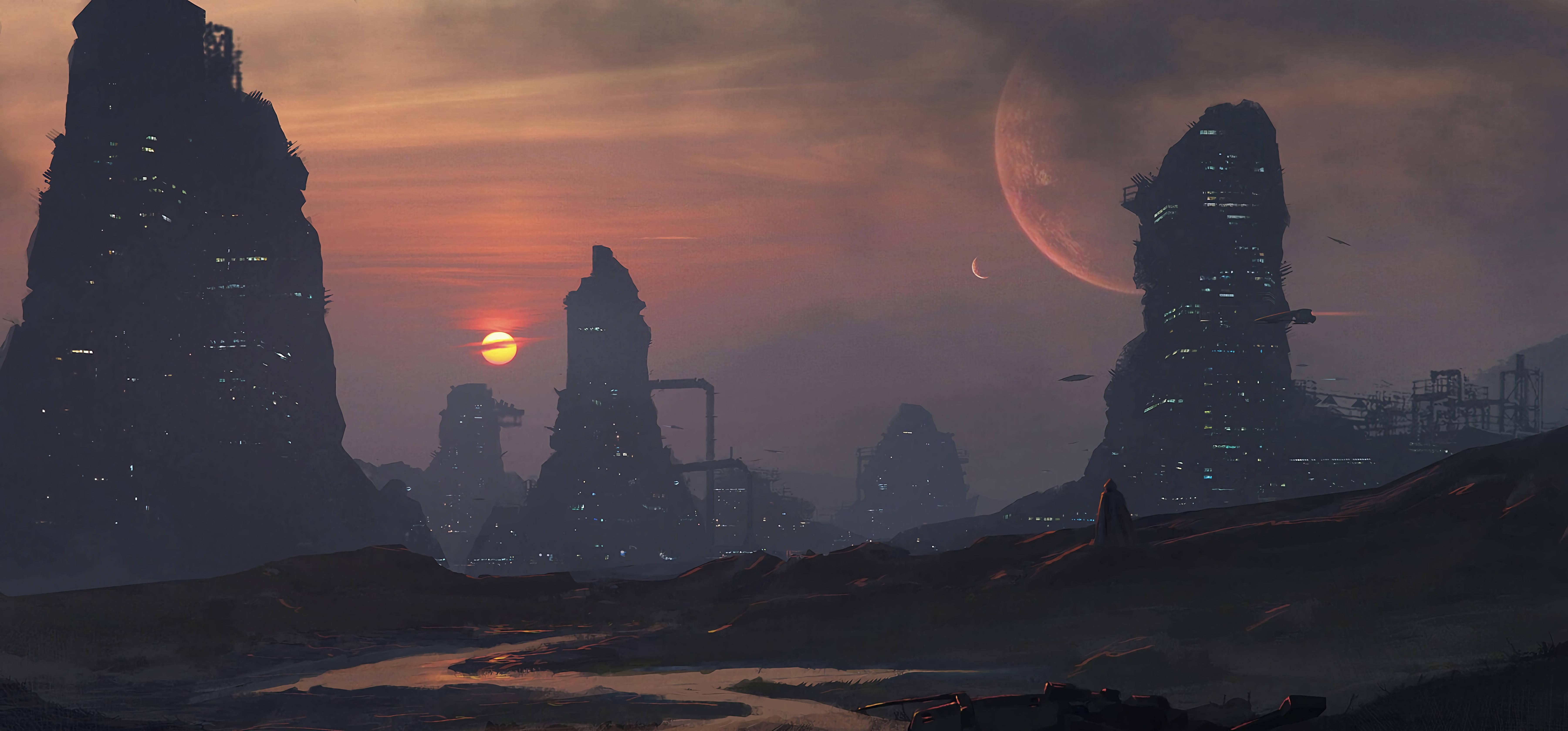 Explore the magnificent beauty of a fantasy cityscape at sunset in this wallpaper, where majestic colors mesmerize and inspire.