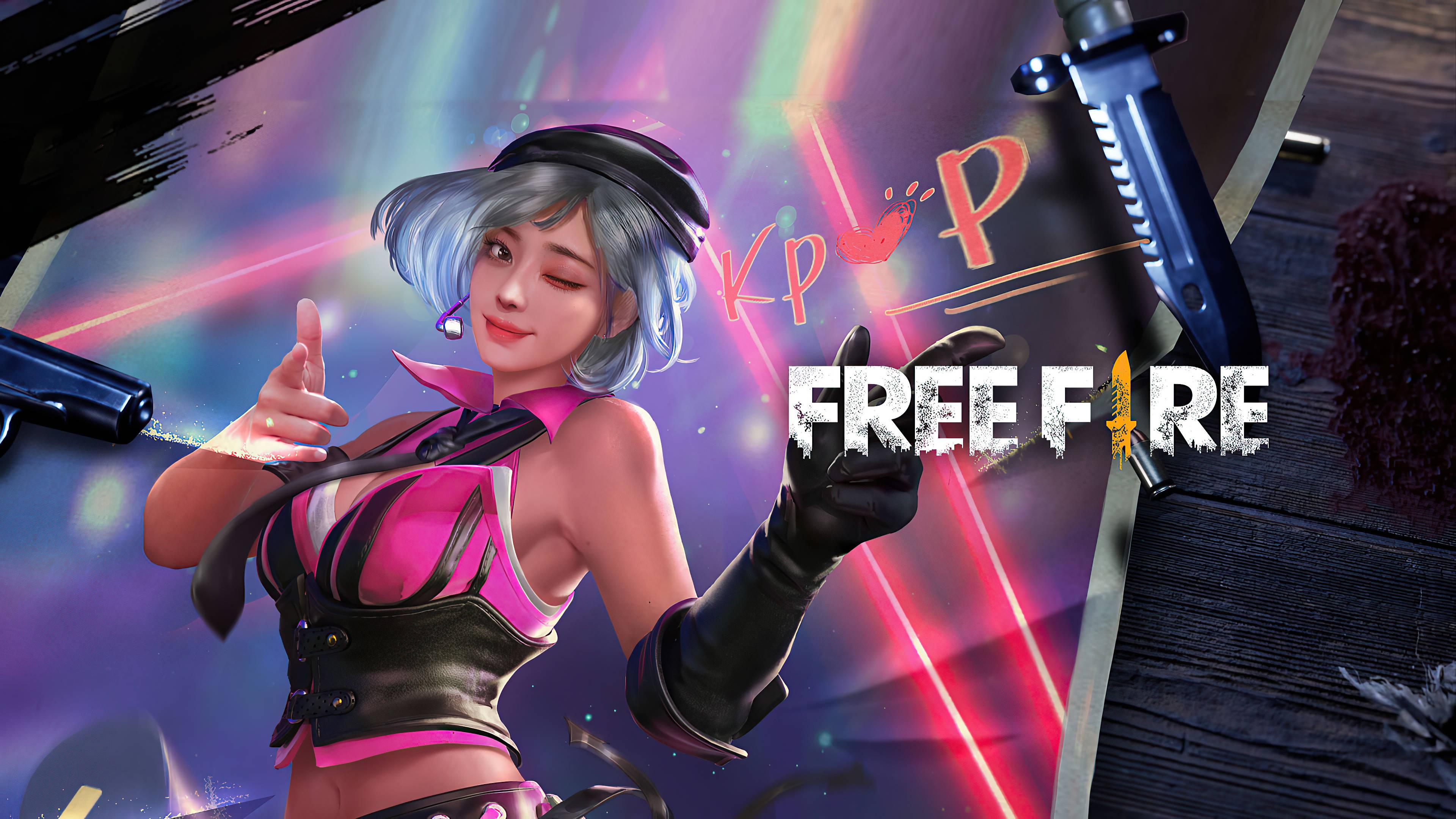 See the Free Fire logo alongside a fierce K-pop girl throwing a knife, merging gaming and pop culture.