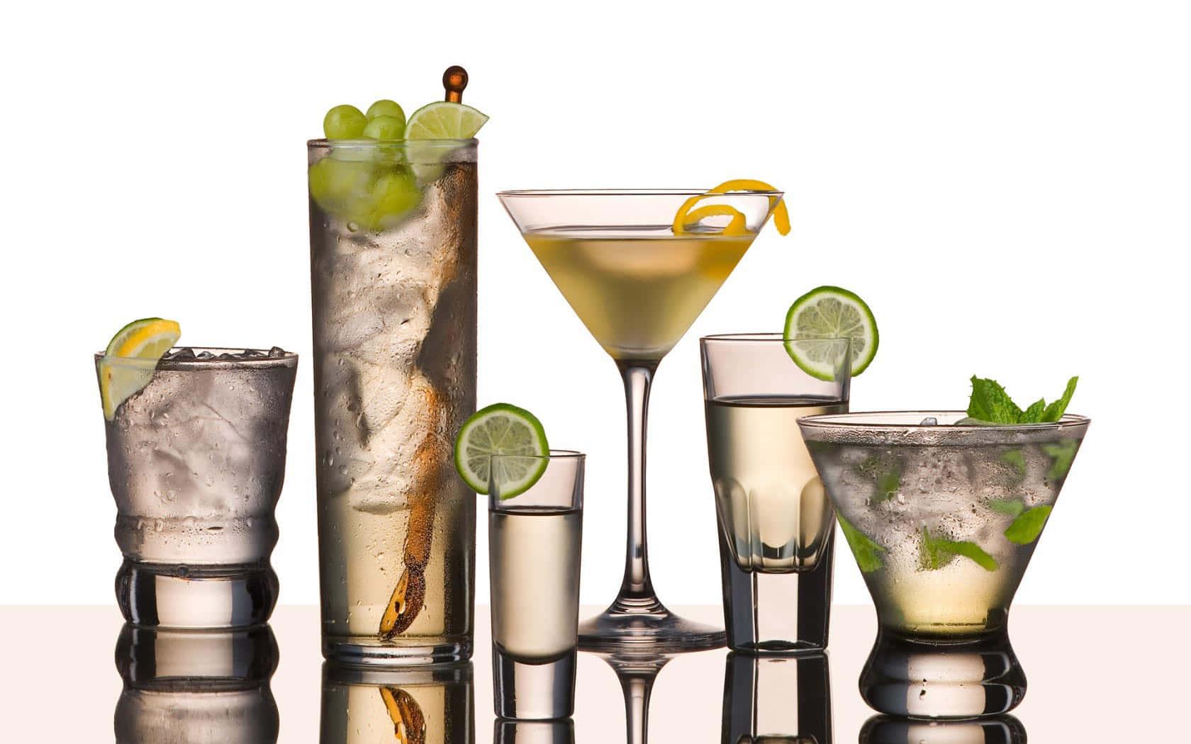 Savor the appeal of six clear fruit cocktails presented on a clean white background, perfect for summer refreshment.