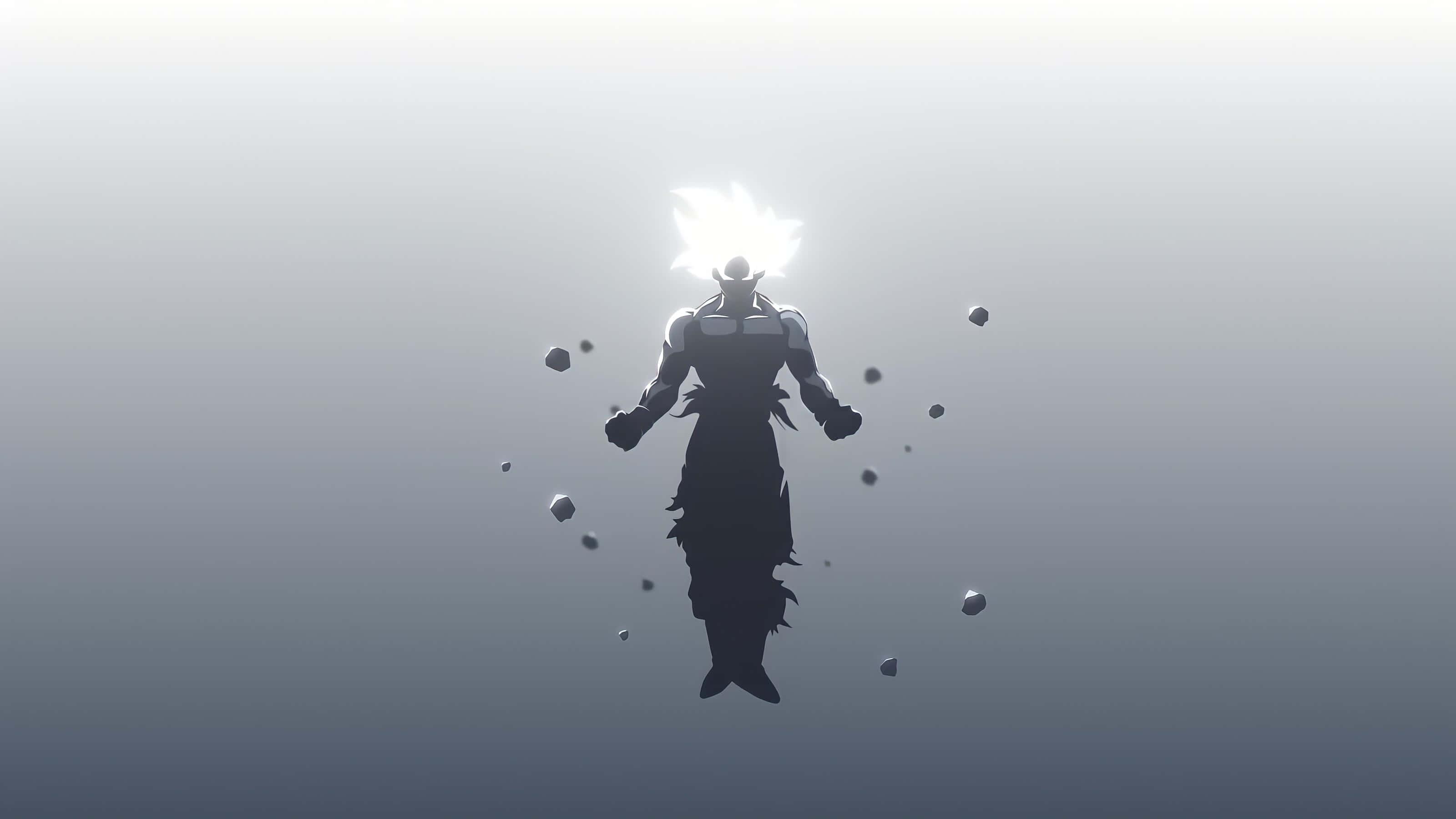 Focused and intense, this dark anime boy stands amidst undefined shapes, surrounded by a captivating gradient of purple to blue.