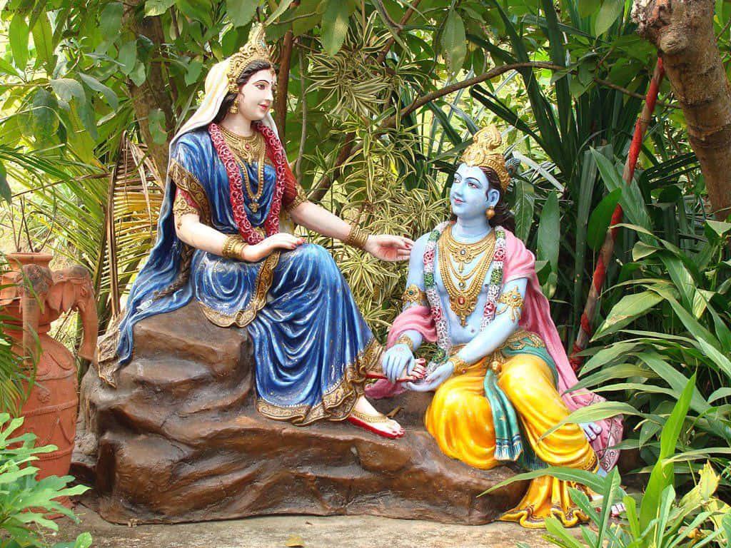 Discover the enchanting sight of Krishna and Radha statues harmoniously set within a lush forest.