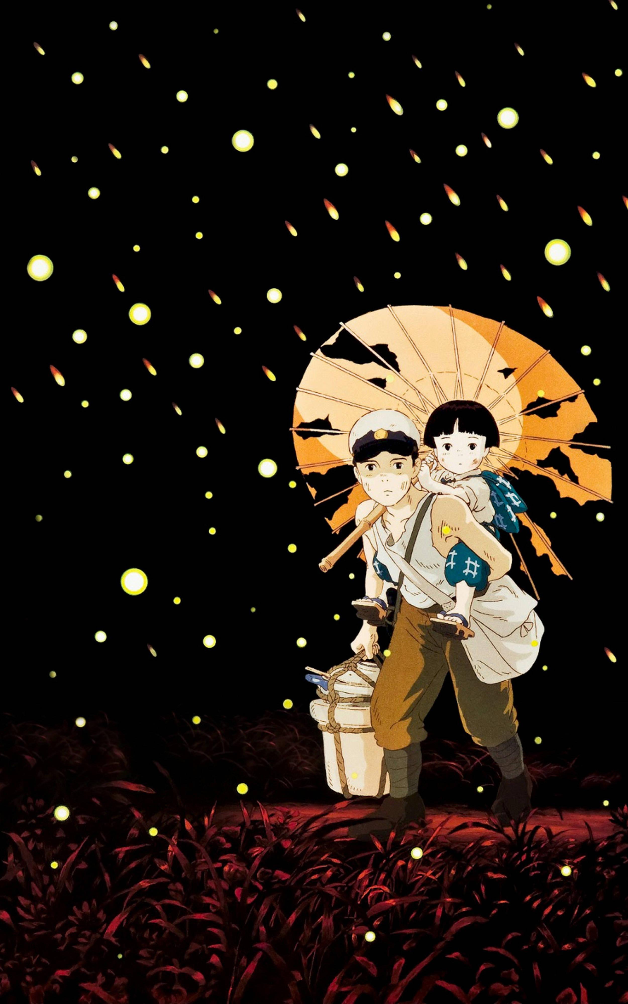 Reflect on the poignant story of Grave of Fireflies with this emotional mobile wallpaper of Seita carrying his sister through a firefly meadow.