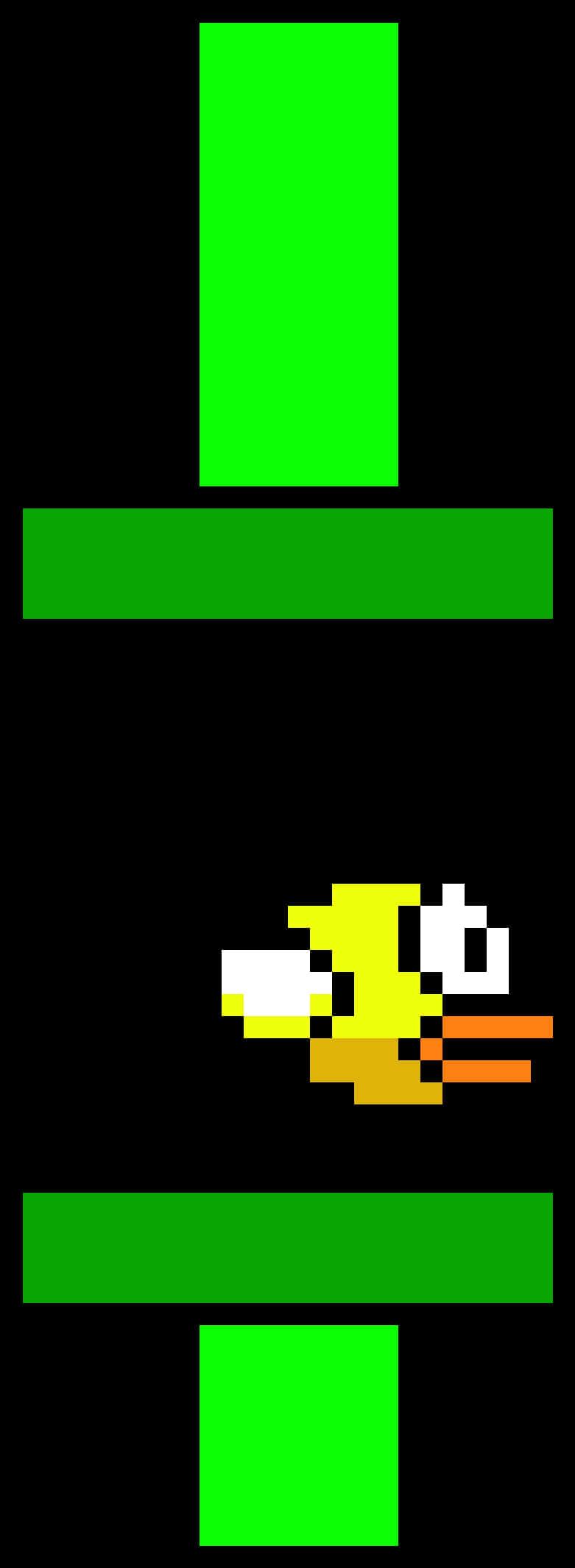 Dive into nostalgia with this pixelated Flappy Bird wallpaper, capturing a yellow bird soaring between green pipes on a bold black backdrop.