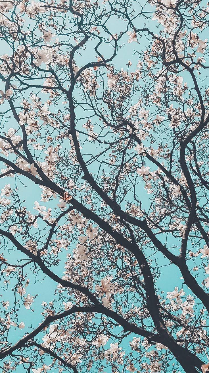 Experience the beauty of a Cherry Blossom tree in pastel pink and blue colors, captured from a low angle.