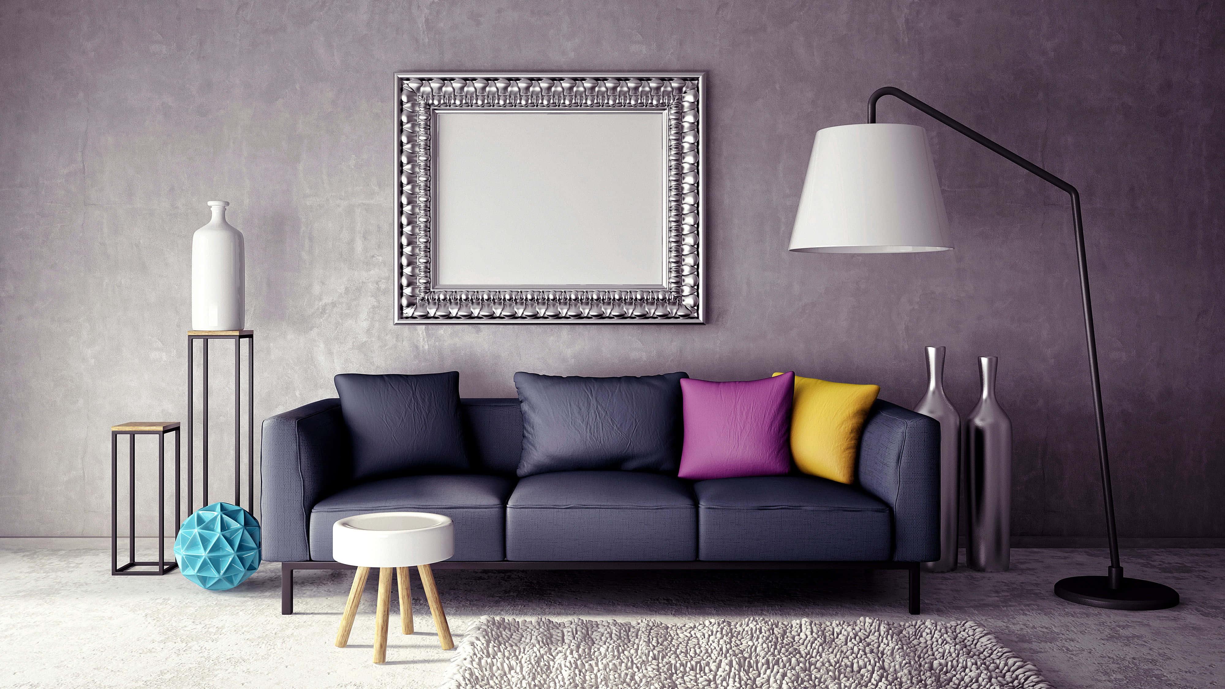 Create a contemporary living room with a purplish gray wall and dark gray couch, accented beautifully with colorful throw pillows.
