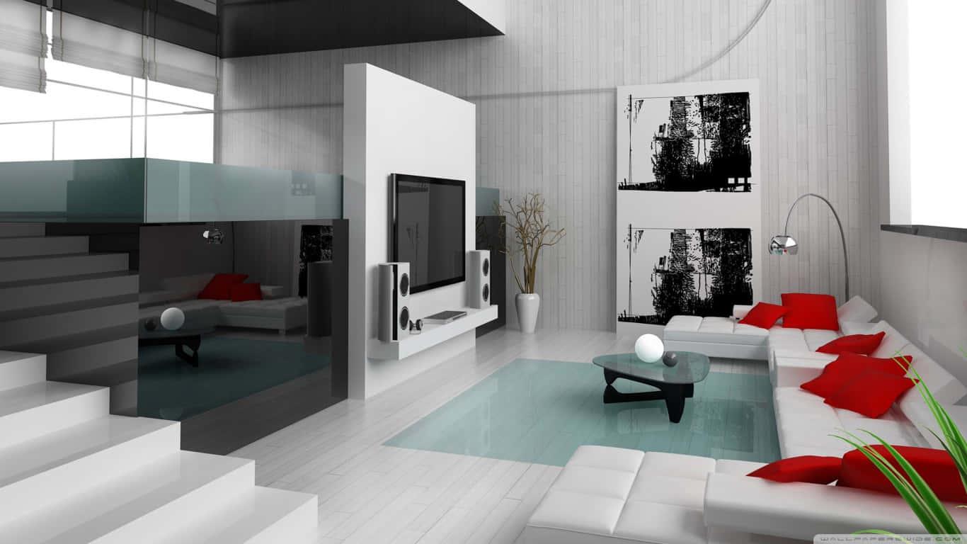 Step into a sleek retro futuristic home filled with minimalist white couches and striking red accents for a unique design experience.
