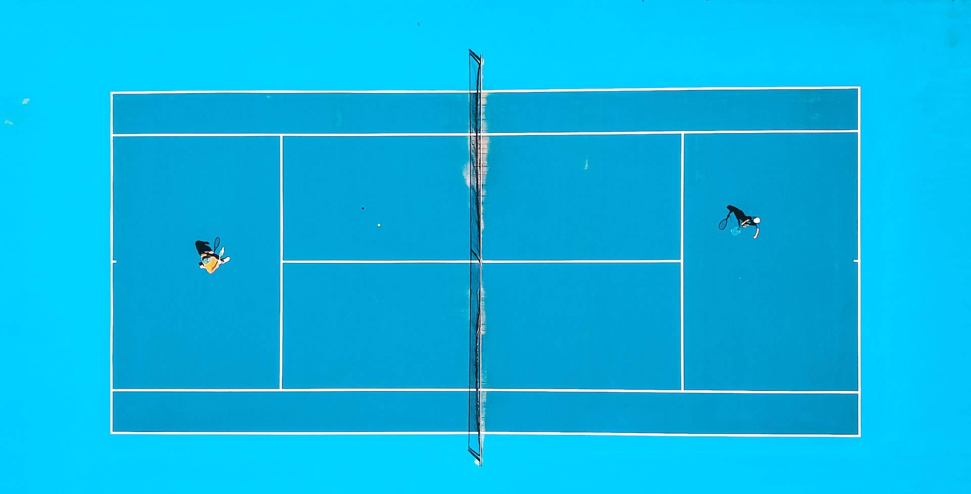 Experience the thrill of tennis with this wallpaper of two players competing on a stunning blue court, ideal for sports lovers.